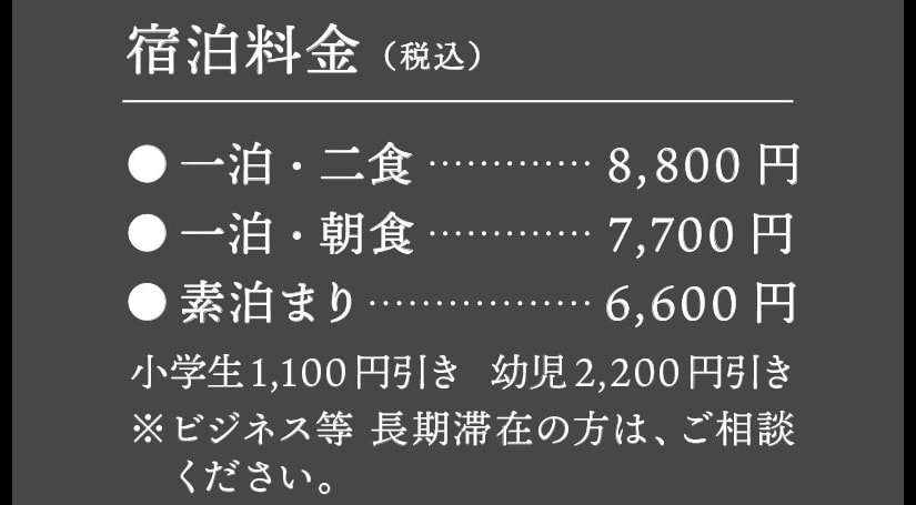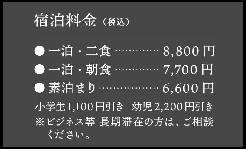 日頃より、旅館 安田館をご愛顧いただきまして誠にありがとうございます。昨今の原材料費、光熱費などの高騰により、令和7年(2025年)1月よりご宿泊料金を一律 1,100円(税込)値上げさせていただきました。何卒ご理解賜りますよう、よろしくお願い申し上げます。